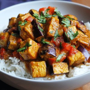 Falso tofu salteado con berenjenas al curry y Burgo de Arias 0%