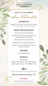 Un flechazo –total y absoluto–, con una propuesta gastronómica diseñada especialmente para dos, en un completo menú degustación a compartir que incluye (a elección de los enamorados) una cuidada bodega. Disponible en el restaurante el desde el 13 al 15 de febrero en comidas y cenas, podrás escribir tu propia historia de amor el día que prefieras. Para empezar y abrir boca, no puede faltar Jamoncito “del bueno” con sus picos y regañás y una copa de Cava Juvé y Camps Reserva de la Familia. ¡Que no falten motivos para brindar! Para continuar, todo al centro con Tosta de ahumado estilo nórdico, Corazón de flor de alcachofa confitada con corazón caliente y velo ibérico, Frutos del mar con salsa picantona y Entrecot de vaca con salsa de pimienta rosa y patatitas al gratén. Para finalizar San Valentín Sweet, elaborado por el obrador de Casa Suecia especialmente para la ocasión.
