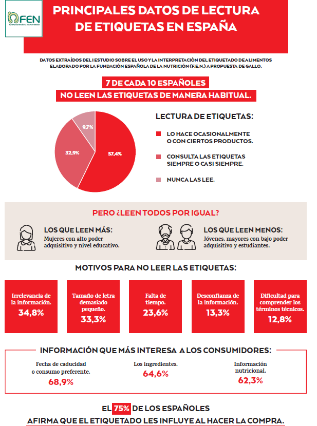 En España, la lectura del etiquetado de los productos sigue sin ser un hábito consolidado entre los consumidores. El etiquetado ayuda a saber qué contiene cada alimento y en qué porcentaje para así poder hacer una mejor elección en la elaboración de unos menús más saludables, equilibrados y moderados, sin embargo, hoy en día una gran parte de la población no hace un uso adecuado. Según el I Estudio sobre el Uso y la Interpretación del Etiquetado de Alimentos de la Fundación Española de la Nutrición a propuesta del Grupo Gallo, nueve de cada diez españoles se muestran preocupados por sus hábitos alimentarios. Sin embargo, siete de cada diez admiten que no leen las etiquetas de manera habitual. La investigación, realizada en una muestra de 4.640 personas de entre 18 y más de 70 años de las 17 comunidades autónomas, también señala que ocho de cada diez consumidores consideran que la información proporcionada en el etiquetado no es clara y consideran que muchos términos son difíciles de entender y tan solo un 6,6% asegura comprenderlas.